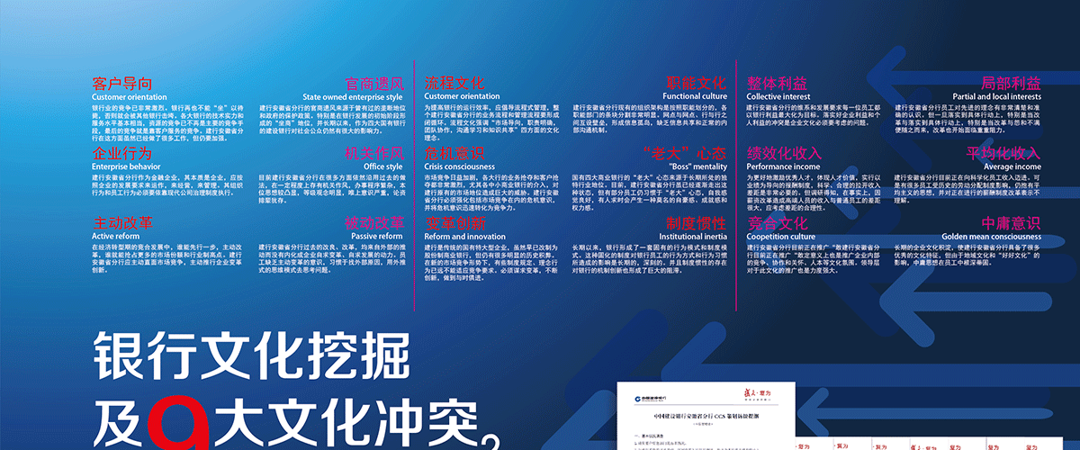 隨著建設(shè)銀行從國有商業(yè)銀行向股份制商業(yè)銀行轉(zhuǎn)軌,對企業(yè)文化有著新的要求和期盼。安徽省分行率先響應(yīng)總行號召實施CCS策劃,解決轉(zhuǎn)軌后的文化建設(shè)需求。比如:如何讓員工不限于本位主義,具有追求完美的精神?如何進一步強化務(wù)實觀念,重視內(nèi)部人才的培養(yǎng)?如何增強員工間的互相認(rèn)可和尊重,形成整體戰(zhàn)斗力?如何更加注重員工的鼓勵,促進民主的氛圍的營造?