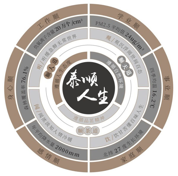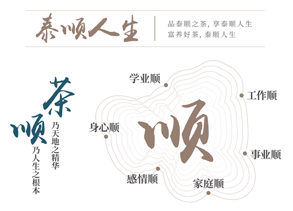 根據(jù)泰順縣名稱由來——“國泰民安,人心歸順”等寓意美好的詞匯,從中挖掘“泰順三杯香”的順文化。品泰順之茶,享泰順人生;富養(yǎng)好茶,泰順人生。