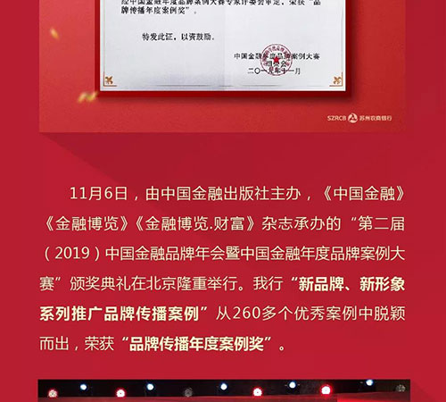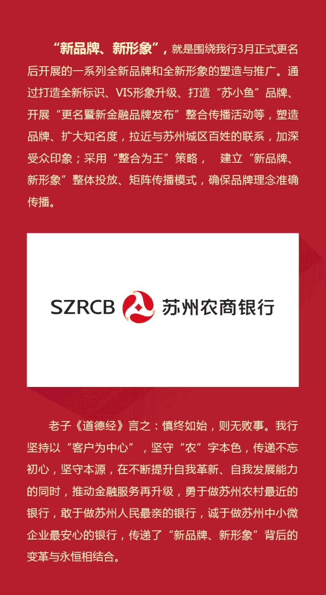 編者按:專業(yè)不負(fù)信賴!2018年底,復(fù)大復(fù)為與蘇農(nóng)銀行(603323.SH)達(dá)成策劃合作關(guān)系。在一年多的時間里,復(fù)大復(fù)為項(xiàng)目組和銀行工作人員并肩作戰(zhàn),不辭辛勞,深入挖掘銀行品牌文化基因,系統(tǒng)提煉、策劃設(shè)計,為蘇農(nóng)銀行品牌文化傳播建設(shè)提供了價值體系和要素支撐。只爭朝夕,不負(fù)韶華!對蘇農(nóng)銀行榮膺2019中國金融“品牌傳播年度案例獎”表示熱烈祝賀!同時也倍受鼓舞和激勵。