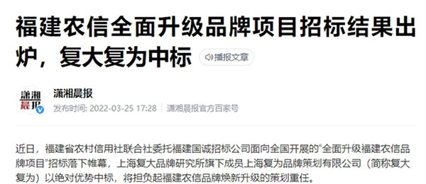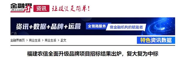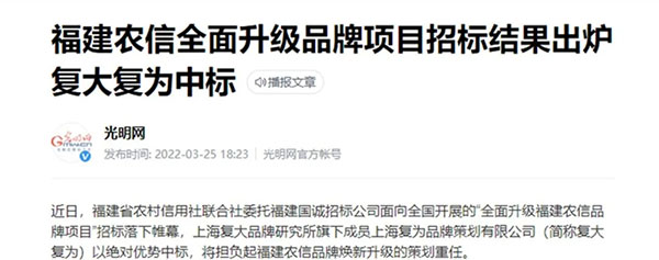 近日,學習強國、光明網(wǎng)、中國經(jīng)濟周刊、金融界等權威媒體集中報道了福建農(nóng)信全面升級品牌項目招標結果,介紹了“全面升級福建農(nóng)信品牌項目”的重要意義,對擔任策劃重任的復大復為給予了極大關注。