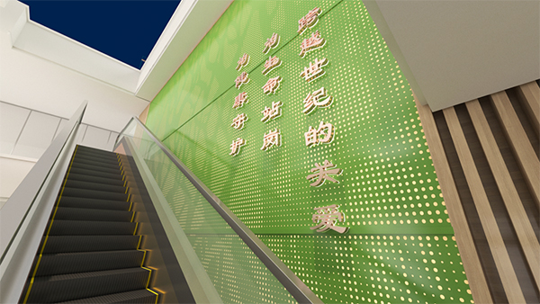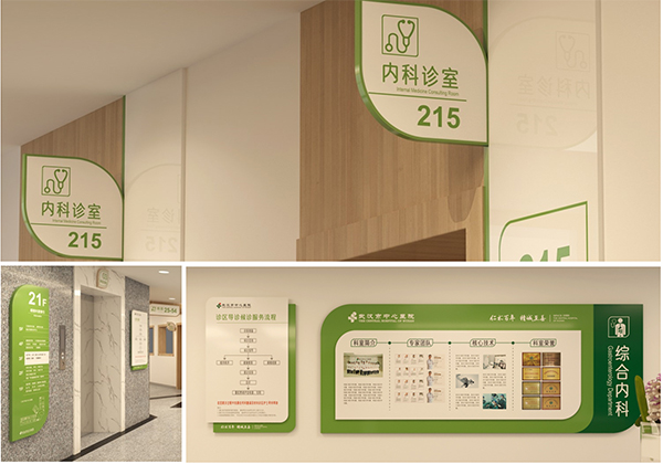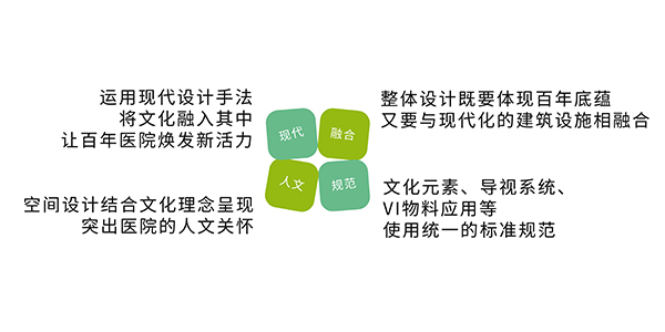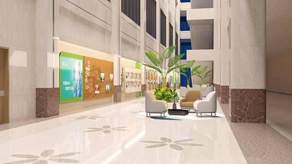 通過(guò)將醫(yī)院文化理念和元素融入環(huán)境中,形成濃厚的文化氛圍,重新激活老院區(qū)的文化活力,激發(fā)員工的文化自信和“百年醫(yī)院”自豪感。選取代表生命力的綠色作為品牌主色調(diào),輔以大面積自然原木色,打造雅致寧?kù)o的、人文性強(qiáng)的空間環(huán)境,提升患者就醫(yī)體驗(yàn)和社會(huì)口碑。