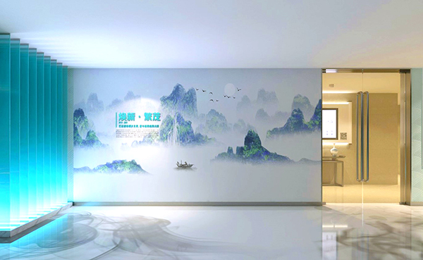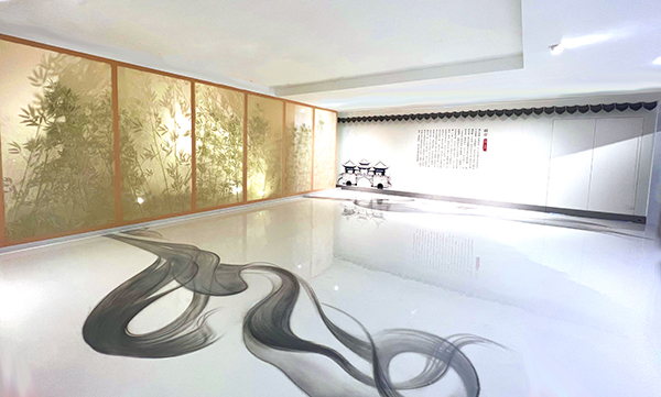 設(shè)計(jì)中還融入了古典水墨畫的特點(diǎn),并以傳統(tǒng)作畫方式將墨跡揮灑于地板之上,呈現(xiàn)文人墨客的浪漫情愫,成為貫通動(dòng)線傳遞歷史文脈。同時(shí),配合強(qiáng)弱交織的燈光,形成光與影的交錯(cuò),增添空間的動(dòng)態(tài)韻律。目之所及,猶如置于流水之上,波光凌凌,實(shí)體與倒影交相輝映。