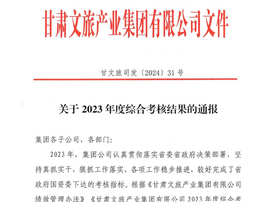 近日,甘肅省文旅產(chǎn)業(yè)集團(tuán)通報(bào)了系統(tǒng)內(nèi)38家單位2023年度綜合考核結(jié)果。甘肅絕色品牌策劃有限公司憑借出色的綜合實(shí)力,位列甘肅省文旅產(chǎn)業(yè)系統(tǒng)2023年度A級(jí)前五。