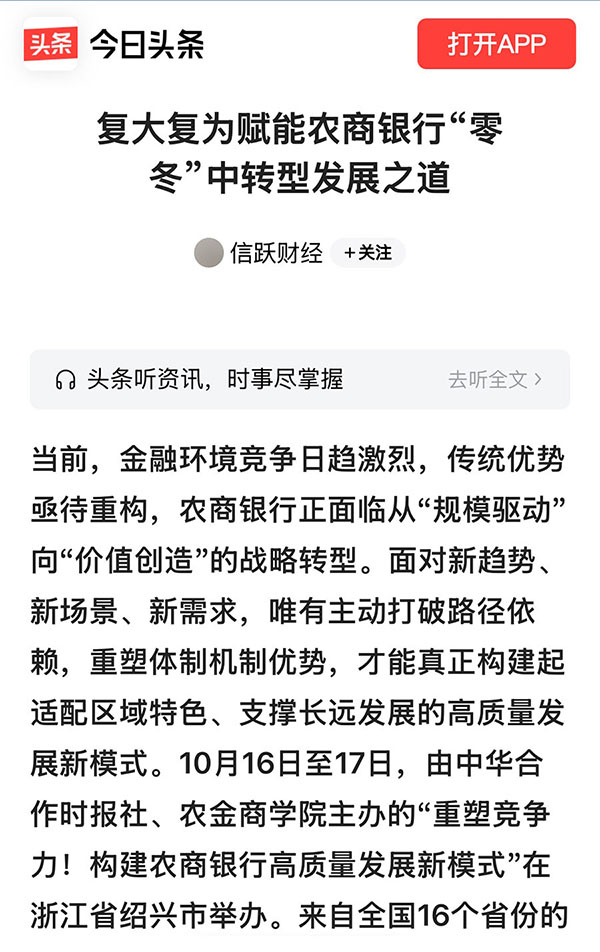 近日,“重塑競(jìng)爭(zhēng)力!構(gòu)建農(nóng)商銀行高質(zhì)量發(fā)展新模式”大會(huì)在浙江紹興舉行。上海復(fù)大品牌研究所、復(fù)為策劃設(shè)計(jì)集團(tuán)副總裁趙文濤應(yīng)邀出席并主題演講,引發(fā)全場(chǎng)200位銀行家共鳴。今日頭條、中華合作時(shí)報(bào)、共工新聞社、鳳凰新聞、網(wǎng)易新聞、騰訊新聞等海內(nèi)外媒體紛紛報(bào)道。其中,“今日頭條”以《復(fù)大復(fù)為賦能農(nóng)商銀行“零冬”中轉(zhuǎn)型發(fā)展之道》進(jìn)行了專題報(bào)道。全文如下: