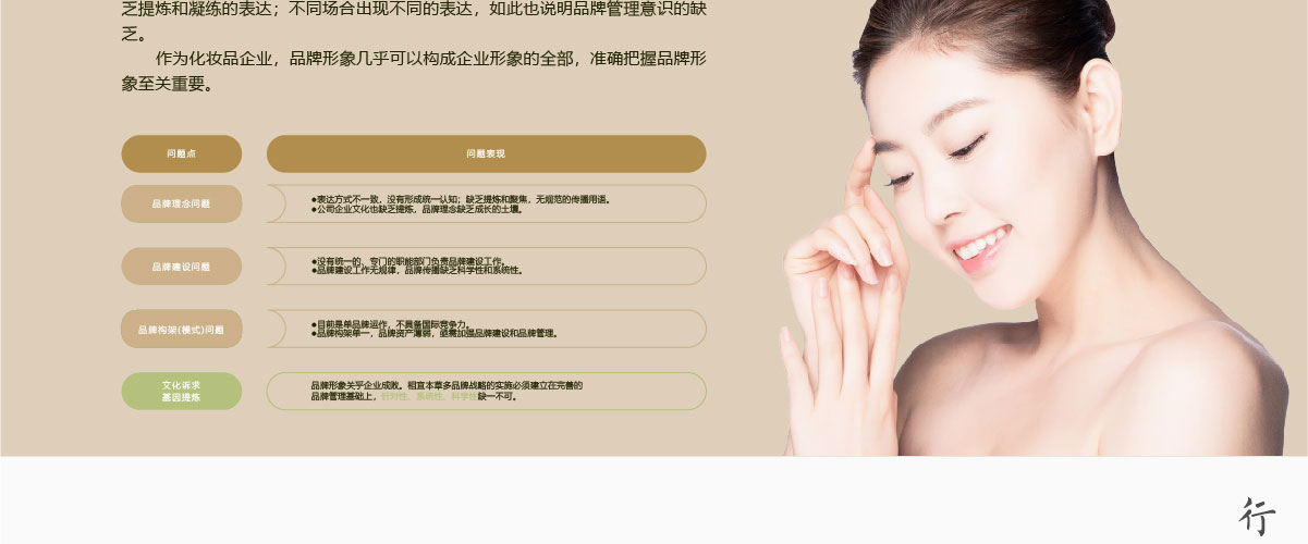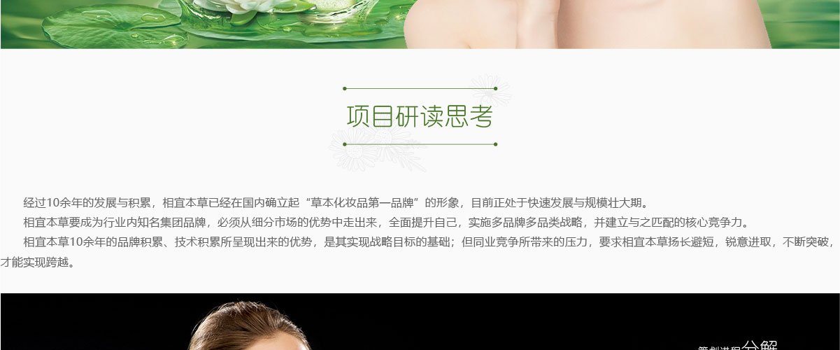 相宜本草,經(jīng)過10余年的發(fā)展與積累,已經(jīng)在國內(nèi)確立起“草本化妝品第一品牌”的形象,目前正處于快速發(fā)展與規(guī)模壯大期。要成為行業(yè)內(nèi)知名集團(tuán)品牌,必須精準(zhǔn)規(guī)劃,全面提升自己的整體品牌形象,達(dá)到統(tǒng)一的、具有傳播力的視覺效果。相宜本草必須注意品牌形象創(chuàng)新意識、客戶視覺印象等的培養(yǎng)和提升,在發(fā)展中完善品牌形象的系統(tǒng)性設(shè)計,實現(xiàn)持續(xù)、健康、穩(wěn)定的成長。
